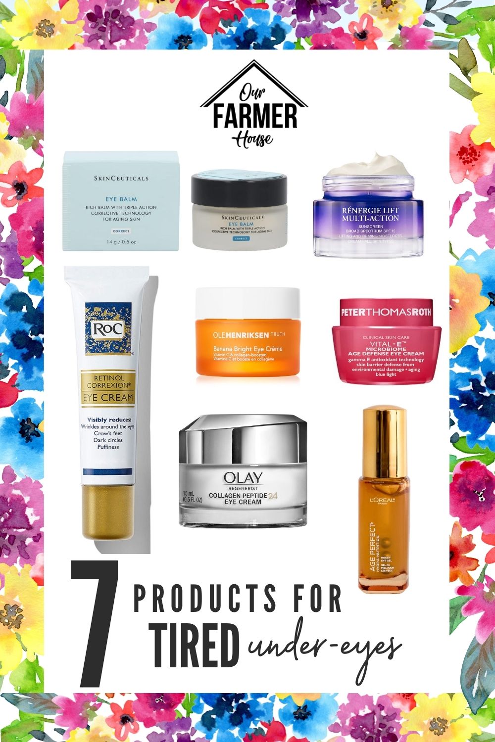 There you have it!  These are my 7 best products for tired under-eyes.  Out of all of the products, my personal favorite, and the product that I’m using right now is the Skinceuticals Eye Balm.  I love it!  I would love to know if you have any tips and tricks to get rid of tired under-eyes and if your go-to product made the list.  Comment and share below and follow on Instagram @ourfarmerhouse.