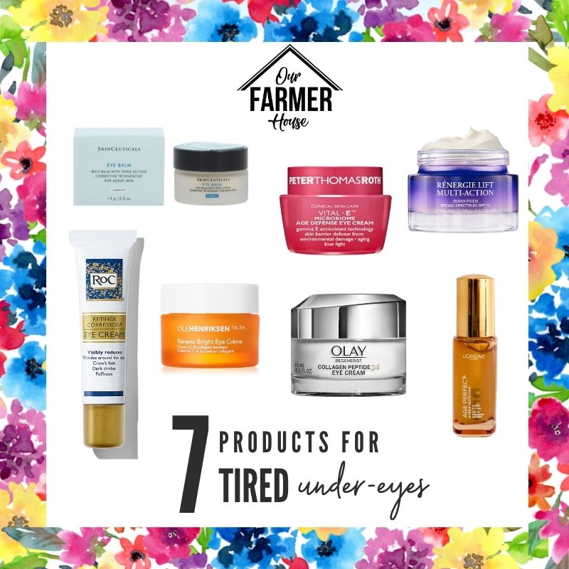 There you have it!  These are my 7 best products for tired under-eyes.  Out of all of the products, my personal favorite, and the product that I’m using right now is the Skinceuticals Eye Balm.  I love it!  I would love to know if you have any tips and tricks to get rid of tired under-eyes and if your go-to product made the list.  Comment and share below and follow on Instagram @ourfarmerhouse.