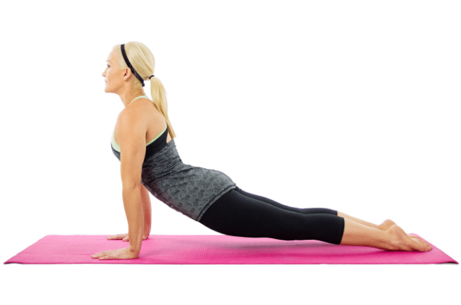 » Do it: Lie on your belly with your legs hip-distance apart and the tops of your feet on the floor. Position your hands to the sides of your chest, then press up to raise your torso all the way up. Keep your shoulders back and down to lengthen the movement. Hold the Vine posture for about 15 seconds, breathing through the move, then transition into the tent posture and hold for 15 seconds. Continue to flow black and fourth between the two poses for 10 reps.