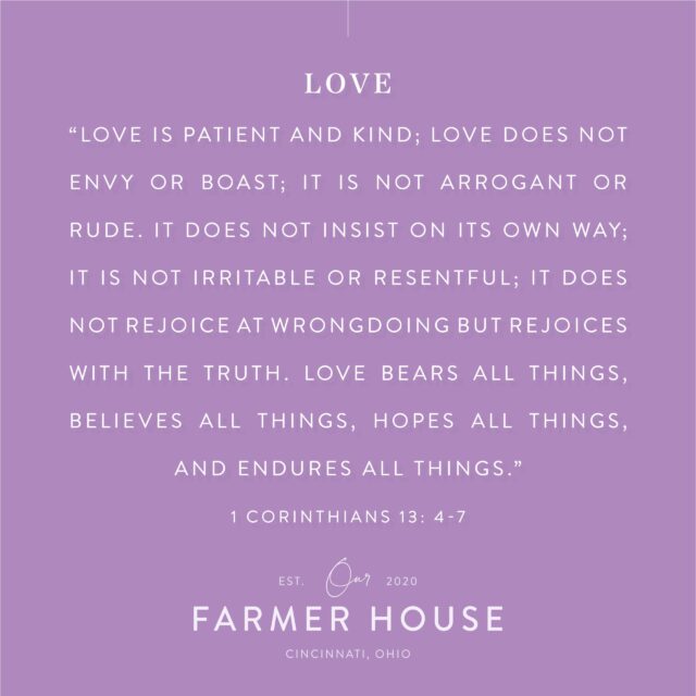 “Love is patient and kind; love does not envy or boast; it is not arrogant or rude. It does not insist on its own way; it is not irritable or resentful; it does not rejoice at wrongdoing but rejoices with the truth. Love bears all things, believes all things, hopes all things, and endures all things. 1 Corinthians 13: 4-7