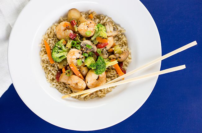 Veggie shrimp stir fry is a dish that can be made fast on a week night and is easily a family favorite. With lots of veggies and high protein value, thanks to the shrimp, a little of this tasty dinner goes a long way. Using brown rice adds more nutrition and fewer carbs than the traditional white rice.