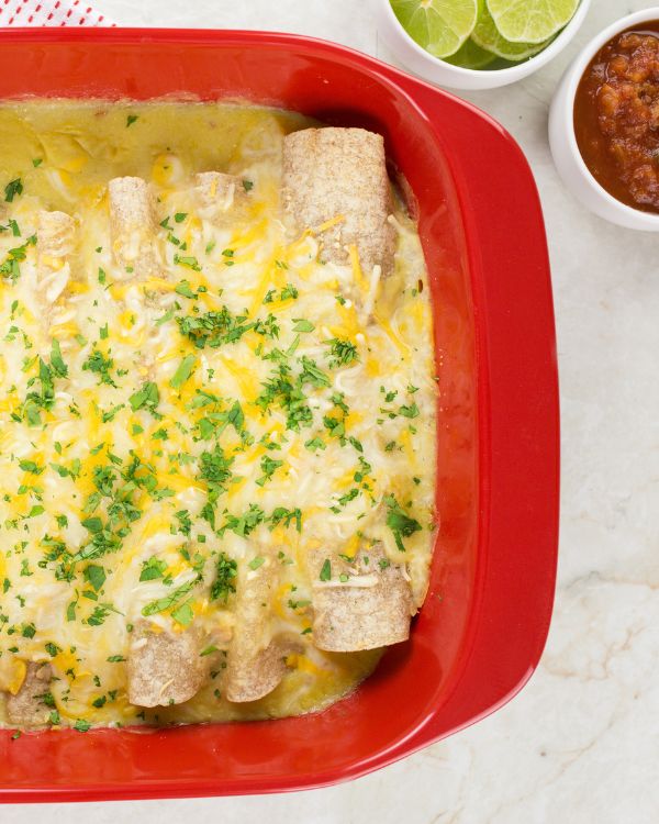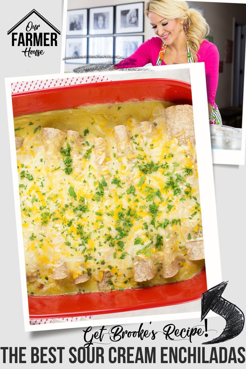 These Lightened-Up Sour Cream Enchiladas are an all-time favorite in our home and a recipe I’ve been making for years—it even made it into my cookbook! There’s something so comforting about a pan of cheesy, creamy enchiladas straight out of the oven. I especially love making this meal for new moms or doubling the batch to surprise a friend or family with a hot, homemade dinner. It’s always a hit when served with cilantro lime rice, chips and salsa, and (of course) an ice-cold Topo Chico.