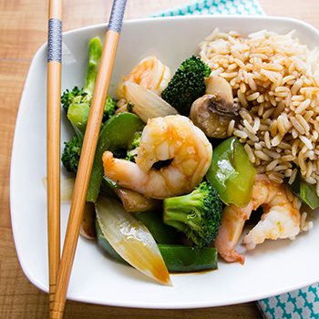 A stir fry is a great way to get dinner on the table in under 30 minutes. My Asian Shrimp Stir Fry is the perfect healthy dinner to ensure your kids get enough protein and vegetables. I start by stir frying some broccoli, green pepper, onion, and mushrooms. Once those are tender, I add my shrimp to cook. The shrimp takes only a few minutes. Then, I top some rice with my stir fry followed by some yummy teriyaki sauce. My Asian Shrimp Stir Fry is the perfect quick meal for a busy weeknight!