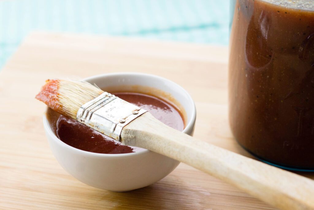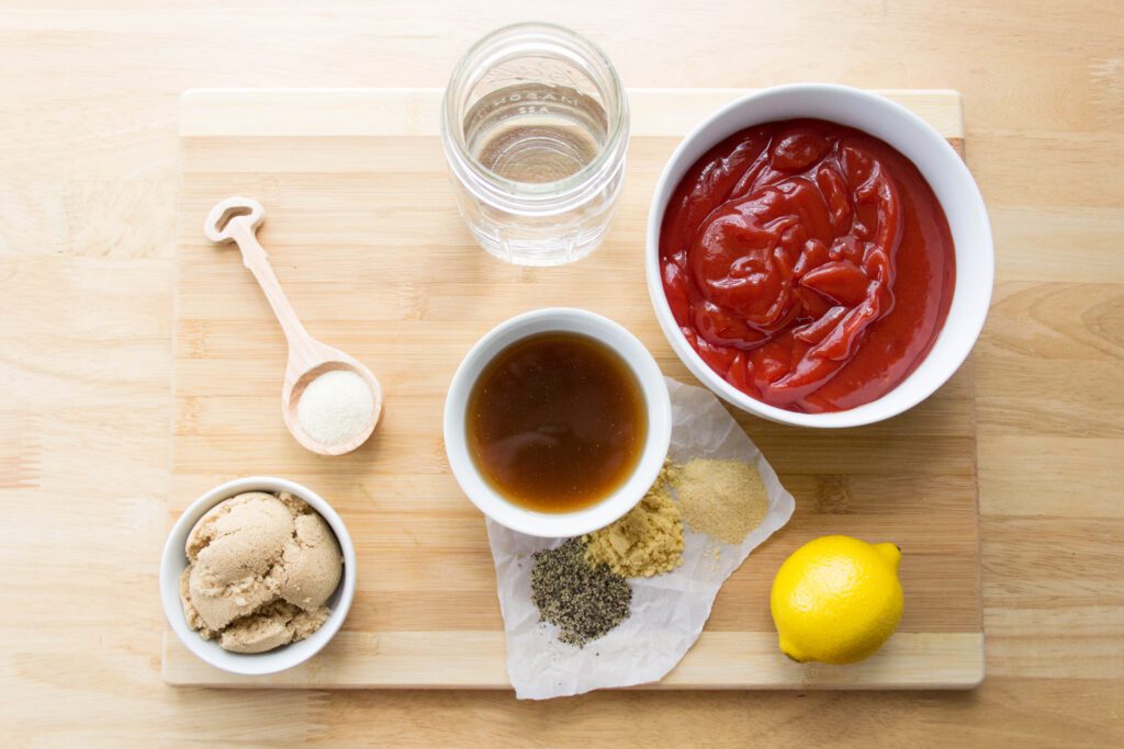 The ingredients vary but most include some variation of vinegar, tomato paste, mustard, ketchup, or mayonnaise (or a combination thereof) as a base, as well as liquid smoke, onion powder, and sweeteners such as sugar or molasses.