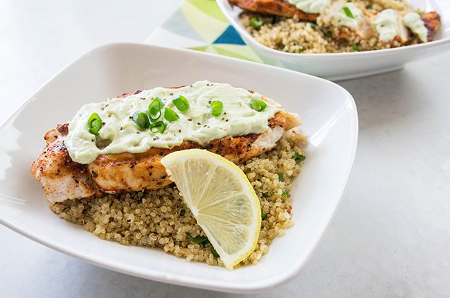 This clean-eating recipe for Blackened Chicken with Avocado Cream Sauce is one of my favorites! It combines the rich flavors of blackened chicken with a creamy avocado sauce and I serve it on top of a seasoned quinoa salad. You can opt to serve it over a bed of fresh greens and veggies in place of the quinoa to cut back on the number of carbohydrates per serving.