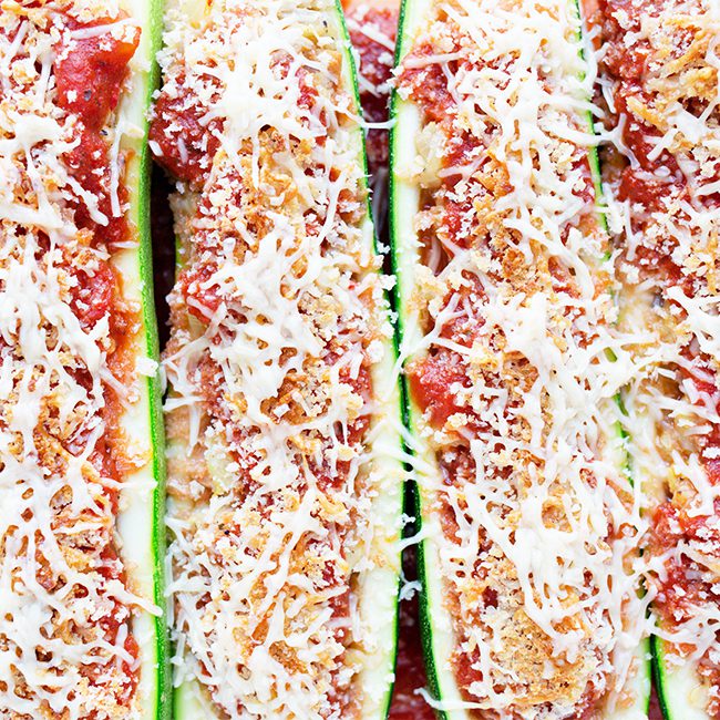 - Evenly fill each zucchini boat with the sausage filling, and pour the remaining 1½ cup of sauce over the tops.