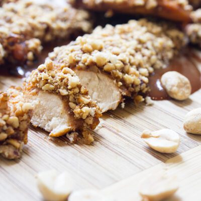 Now, you can do the next step one of two ways. First, you can dip both sides of your chicken into the sauce until completely coated. Once coated, dip your chicken into the peanuts and coat evenly. Place onto the baking sheet and bake. Second, if you would like to marinate the chicken, pour the sauce into the zip-top bag with the chicken and allow to marinate in the fridge up to 1 hour. After marinating, dip the chicken into the peanuts and coat evenly, then bake. Bake your chicken for 25-30 minutes until the chicken is cooked through and the nuts are golden brown. Serve while hot.