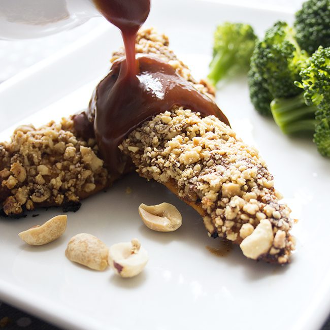 Now, you can do the next step one of two ways. First, you can dip both sides of your chicken into the sauce until completely coated. Once coated, dip your chicken into the peanuts and coat evenly. Place onto the baking sheet and bake. Second, if you would like to marinate the chicken, pour the sauce into the zip-top bag with the chicken and allow to marinate in the fridge up to 1 hour. After marinating, dip the chicken into the peanuts and coat evenly, then bake. Bake your chicken for 25-30 minutes until the chicken is cooked through and the nuts are golden brown. Serve while hot.