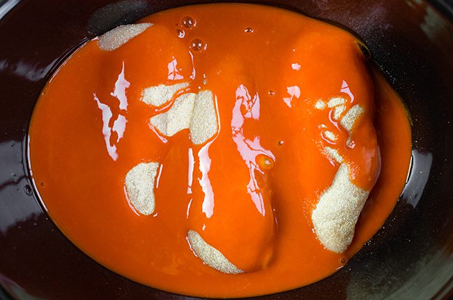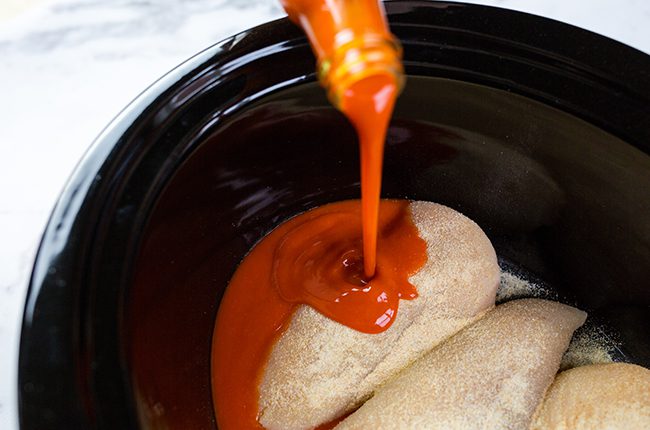 - To make the chicken: Place the chicken in the slow cooker and pour the wing sauce, garlic powder, and onion powder over it.