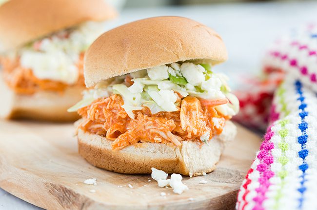 My Crockpot Buffalo Chicken Sliders are perfect for your game-day party. Bite-size and 150 calories each. With the addition of blue cheese and ranch to calm down the hot wing sauce your guests and family will enjoy these mini crockpot buffalo chicken sliders! If you have any leftovers (chances are you won’t!), pack them for lunch the next day either on extra slider buns, or even in a whole-wheat pita. If the coleslaw is all gone, just cut up some carrot or celery sticks to dip in ranch.