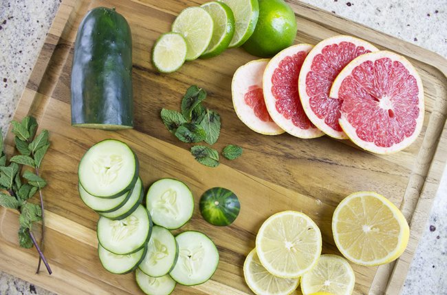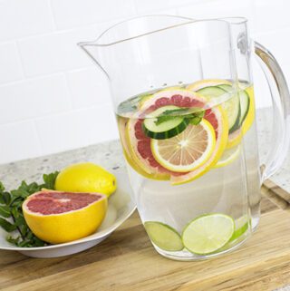 Achieving a flat belly starts with what you are putting into it. You want to focus on adding anti-inflammatory foods. In this Detox Water Recipe we use cucumbers to prevent water retention and they also have many anti-inflammatory properties. Limes provide the cleansing effect of citric acid to help clear out the digestive system while grapefruit or oranges contain flavonoids in the peel and juice that stimulate the immune system. They also protect the body against a fungi/pests while helping to reduce cholesterol levels.