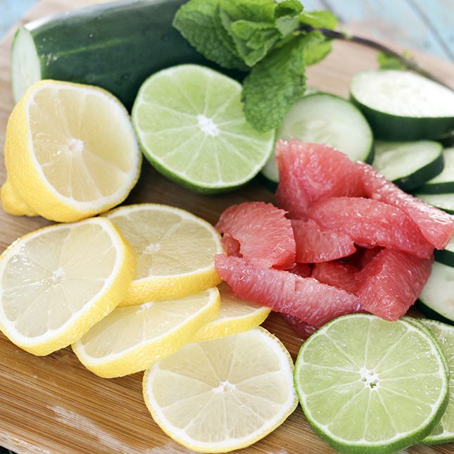 Achieving a flat belly starts with what you are putting into it. You want to focus on adding anti-inflammatory foods. In this Detox Water Recipe we use cucumbers to prevent water retention and they also have many anti-inflammatory properties. Limes provide the cleansing effect of citric acid to help clear out the digestive system while grapefruit or oranges contain flavonoids in the peel and juice that stimulate the immune system. They also protect the body against a fungi/pests while helping to reduce cholesterol levels.