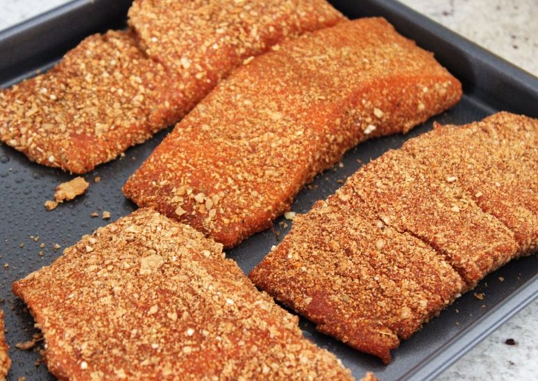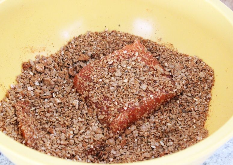 - Dip salmon into seasoning and press seasoning onto salmon until the salmon is completely covered with seasoning mixture.