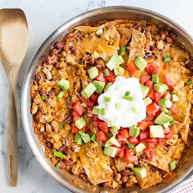 This is all the goodness of a burrito but in the form of a one-pan meal! Save the steps (and calories) of baking and rolling the burrito, and instead eat it in a deconstructed version. This low-calorie dinner recipe is easy for everyone to dig into—plus, cleanup will be a breeze!