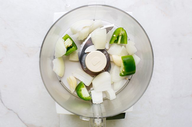 - In a food processor, pulse the garlic, onion, and jalapeño pepper together until they are a very small dice.