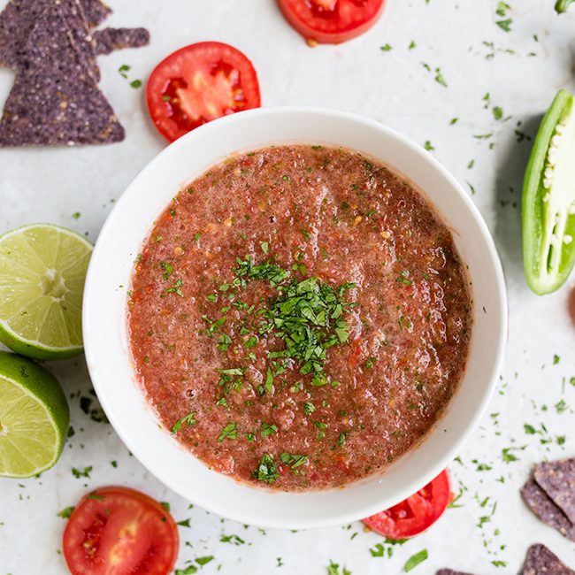 For added flavor, consider roasting the tomatoes, jalapeno’s, and even the garlic before blending together. To kick the heat up a notch, leave the seeds from the jalapeno in the mix, or add a full pepper.