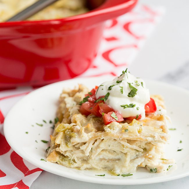 My Green Chilie Chicken Lasagna is a Southwest take on a classic dish. The green chilies give this dish a little kick, and the creamy yogurt-based salsa verde and ricotta cool it off. Top it off with Monterey Jack cheese and you’ll have one kickin southwestern dinner!