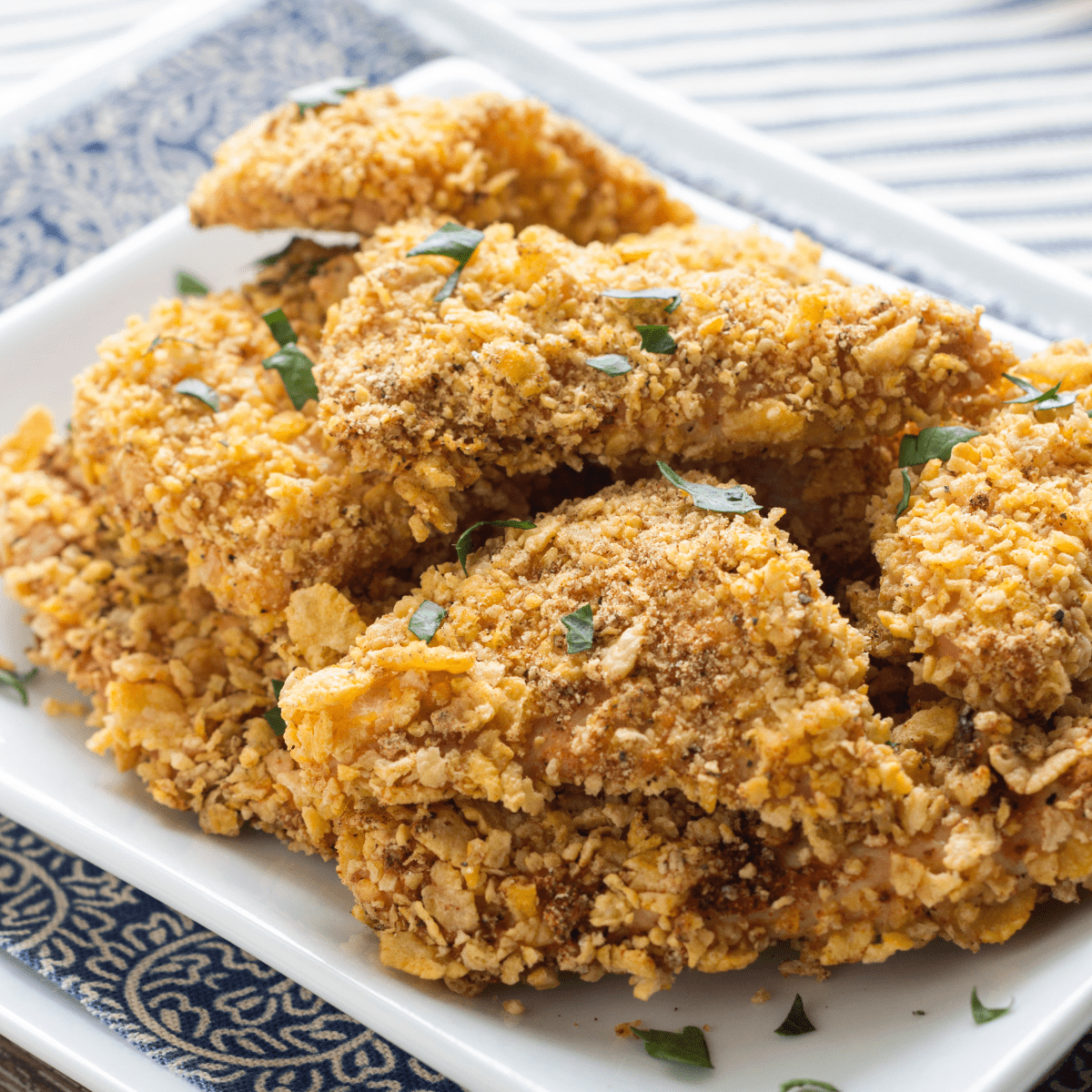 Crispy fried chicken recipe on a white plate that is sitting on top of a blue plate