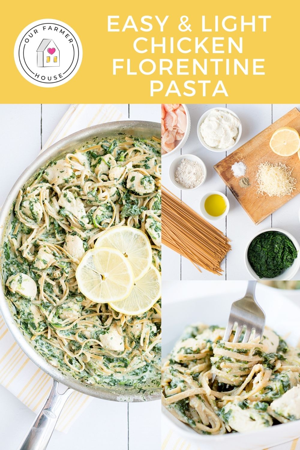 Creamy, cheesy pasta is a dinner that our whole family can agree on! By adding veggies to the mix, I created a Light Chicken Florentine Pasta and my family loves it! The sauce is a creamy mix of ricotta and Parmesan cheeses along with healthy spinach and tart lemon juice. I like to swap regular noodles with whole wheat noodles or high protein noodles for iron, protein, and fiber for a lighter take. It is the perfect meal done in under 45 minutes. The whole family will love how healthy and delicious my Light Chicken Florentine Pasta is!