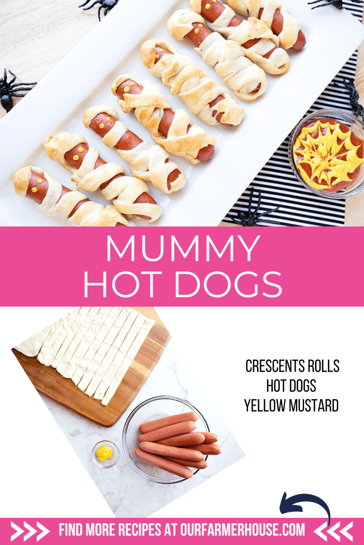 Looking for a fun Halloween dinner idea? You have to make these Mummy Hot Dogs. These crescent roll hot dog mummies are too cute and the family will love them.
