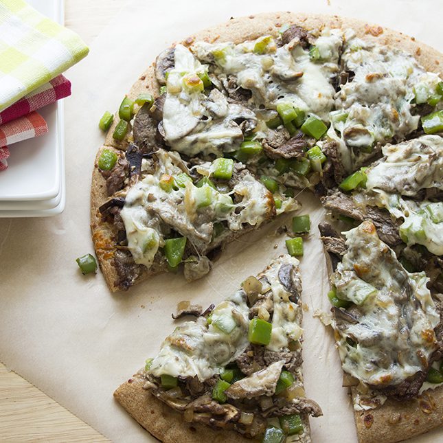I have always loved the combination of steak, bell pepper, onion, and cheese. After the first real Philly cheesecake experience I had, I knew I would be a fan of this combination forever. Adding it to a pizza crust was a moment of genius! I had to make it a bit healthier, of course, so this recipe is made on a thin whole wheat pizza crust.