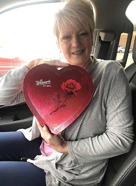 My mom posing with her box of chocolate hearts before her PET Scan on Valentine’s Day