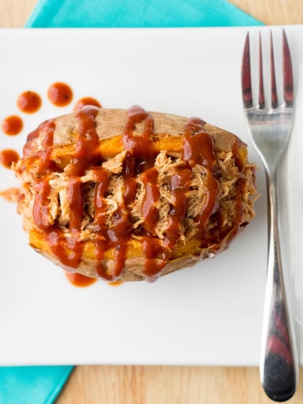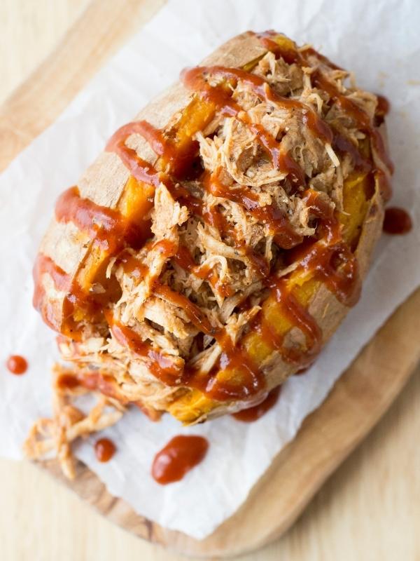 Serving: 1sweet potato, 4 oz pulled pork, ¼ cup BBQ sauce | Calories: 304kcal | Carbohydrates: 42g | Protein: 26g | Fat: 3g | Saturated Fat: 1g | Cholesterol: 73mg | Sodium: 1036mg | Fiber: 4g | Sugar: 23g