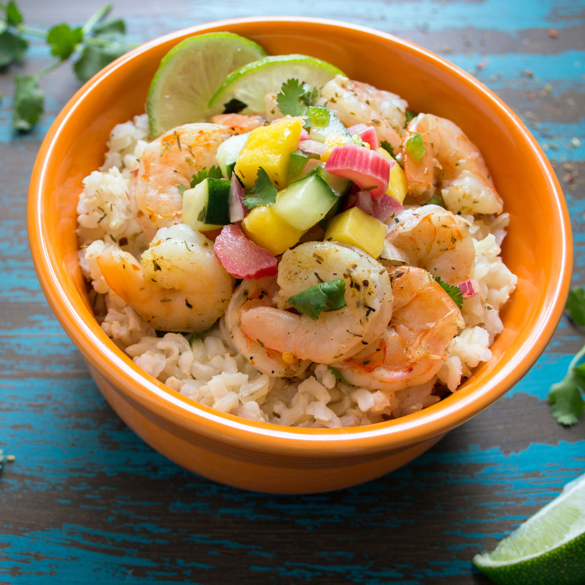 Remove the skillet from the heat and squeeze the fresh lime over the shrimp, and sprinkle the cilantro over them. Toss gently to combine, and serve 7-8 shrimp over ½ cup of rice.