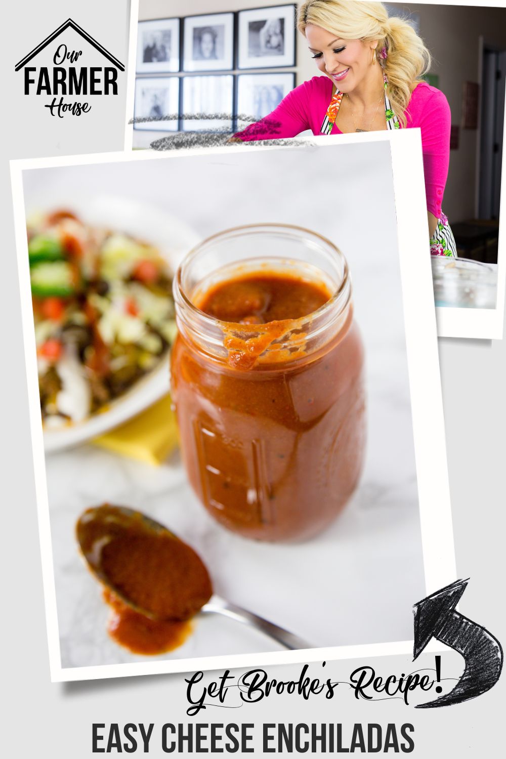 Overhead picture of a jar of enchilada sauce in a jar next to mexican dish