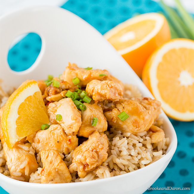 My Healthy Orange Chicken Recipe is by far one of the easiest meals on our menu and it’s a great healthy weeknight meal that everyone enjoys. Chicken is a great lean healthy protein, and the homemade orange sauce adds tons of flavor without all the extra calories. Instead of frying, this is a pan-seared chicken dish that still has great texture and flavor. I like to serve this dish with brown rice and fresh steamed veggies.