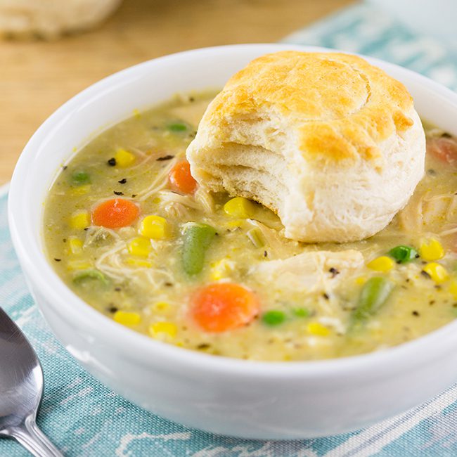 For the biscuits: Preheat the oven to 400° F and bake the biscuits according to the package directions. To serve, place a heaping 1 cup of the chicken mixture in each bowl and top with a biscuit.