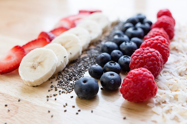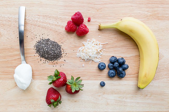 - Pour 8 ounces into two bowls and top each bowl with the remaining sliced bananas, strawberries, blueberries, and 1 tablespoon of toasted coconut and 1 teaspoon of chia seeds.