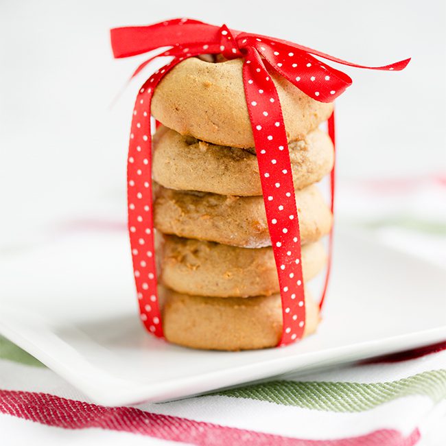 soft chewy gingerbread cookies in a stack with a red ribbon