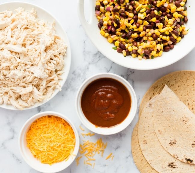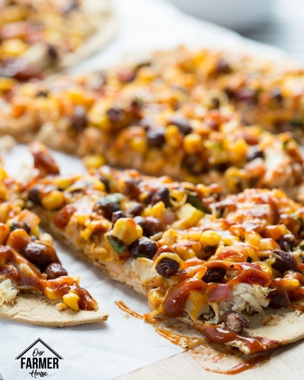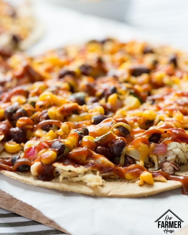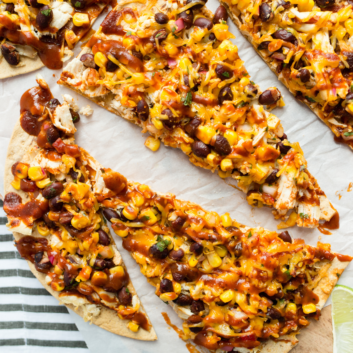- Remove from the oven and top each flatbread evenly with ¾ cup shredded chicken, ¼ cup barbecue sauce, ½ cup Black Bean and Corn Salsa, and ¼ cup cheese.