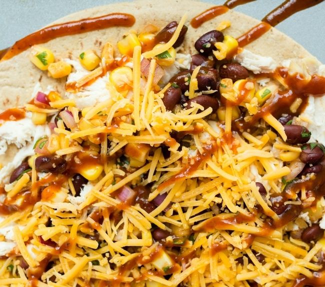 Remove the bread from the oven and cover it with 3/4 cup shredded chicken, 1/4 cup of BBQ sauce, 1/2 Black bean, and corn salsa. Then add 1/4 cup of cheese.