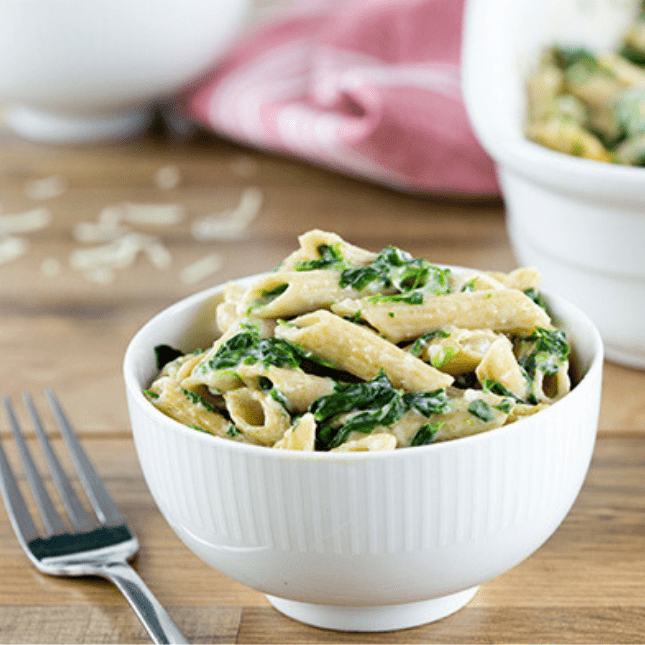 Spinach is a mild flavor addition to this pasta dish that packs a ton of nutrients. Spinach and Alfredo pair wonderfully to create a creamy sauce over whole-wheat pasta that even my pickiest of eaters asks for seconds.
