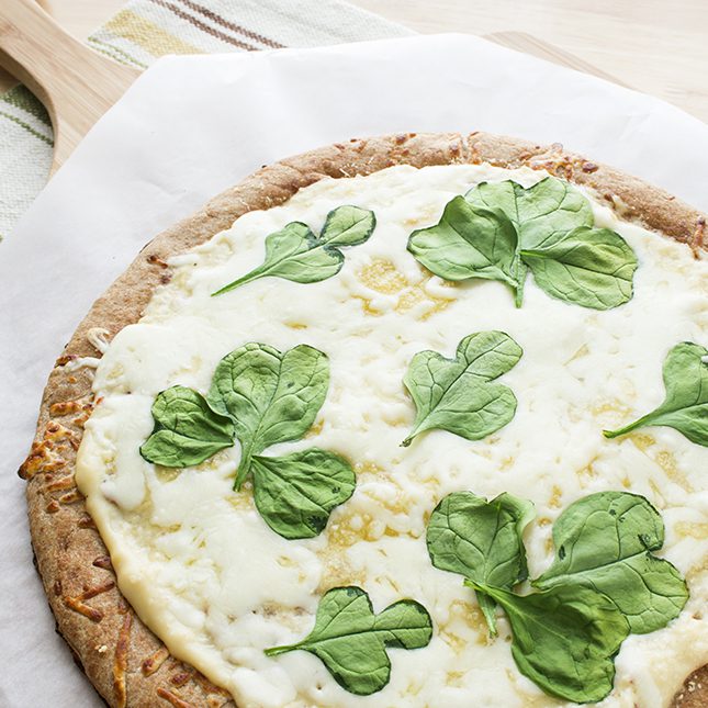 - Next take a few pieces (6-10 leaves) of spinach and using scissors cut each piece into the shake of shamrock. Or form a shamrock out of 3 spinach leaves. Top pizza with cut spinach leaves.