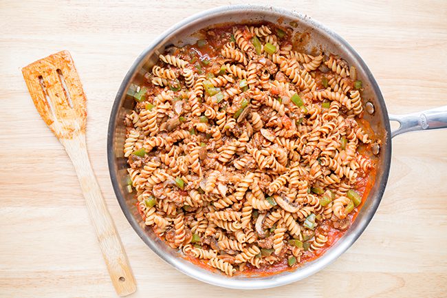 - Return the cooked ground beef back to the skillet and mix with the vegetables. Reduce the heat to low. Pour the pasta sauce into the skillet. Add the Italian seasoning and mix well. Stir the cooked pasta into the skillet, making sure to evenly coat the pasta.