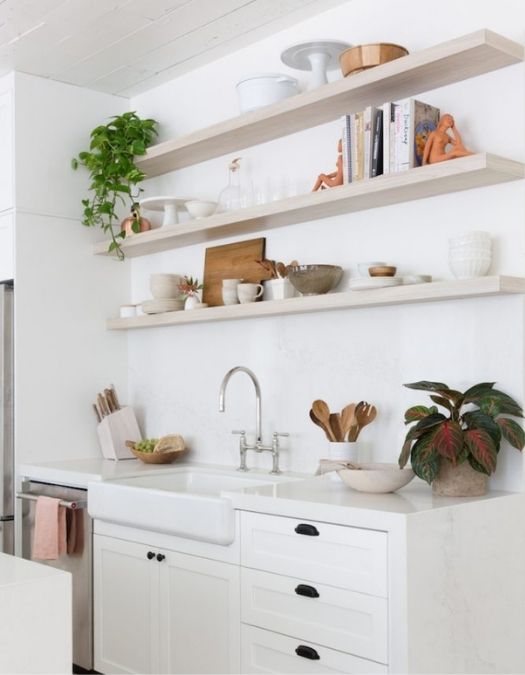 I like the look of open shelving in the kitchen, so I decided to go with a combination of white-colored cabinets and three large open shelves on the back wall.  Instead of ordering the shelves from the cabinet manufacturer, I found custom-made shelves on Etsy that I can stain any color to match the flooring and it saves money too, not to mention the shelves are beautiful!