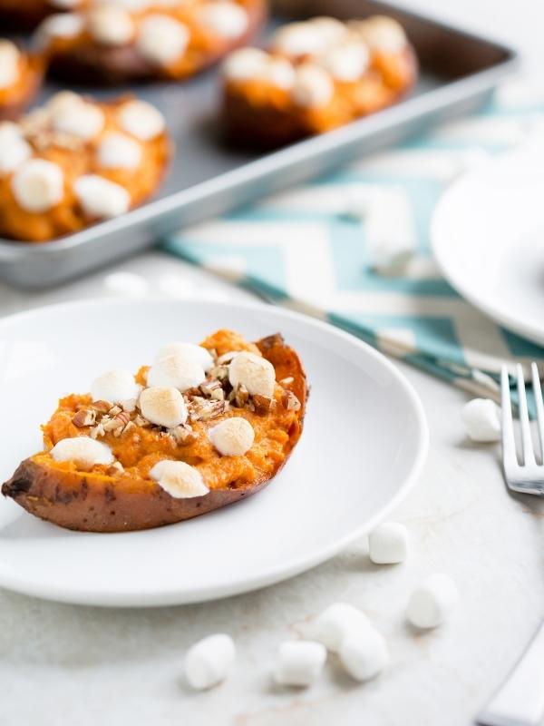 - Evenly spoon the mixture back into the potato skins, and top with chopped pecans and 8 mini marshmallows.