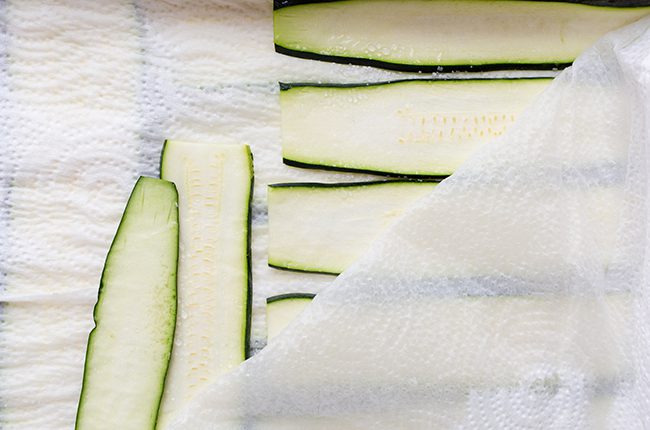 - Line 2 baking sheets or cutting boards with paper towels and place the cut squash on the paper towels. Sprinkle kosher salt evenly on the squash; this helps to draw out the moisture.