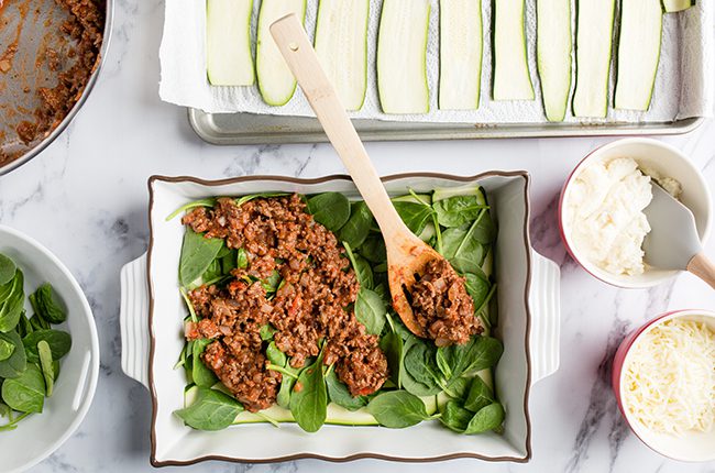 Your last step before popping into the oven is to assemble the layers of your lasagna. You will start with the zucchini slices, and top with spinach, beef, cheese, and then repeat until all ingredients have been used and the pan is full and ready to bake. This is usually 3 total layers.