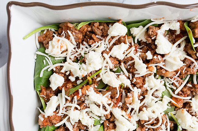 - Assemble the lasagna by placing a ⅓ of the squash on the bottom of the baking dish, followed by ½ of the spinach, ½ of the meat mixture, ½ cup of the ricotta cheese, and a ¼ cup of mozzarella cheese, and then repeat those layers.